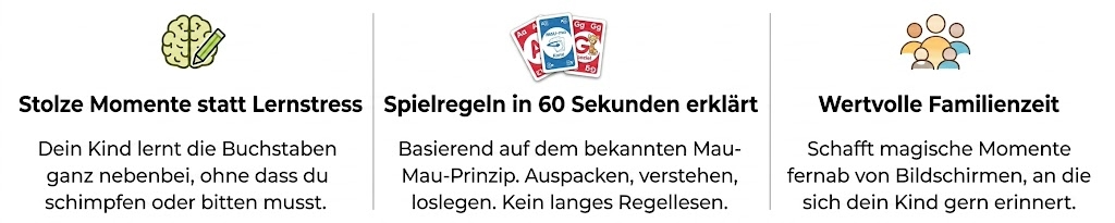 Wir nutzen das bekannte Mau-Mau-Prinzip. Dein Kind konzentriert sich auf den Spielspaß, während das Gehirn ganz nebenbei die Verbindung zwischen Laut, Buchstabe und Anlaut-Tier speichert. Ohne Auswendiglernen, ohne Abfragen.